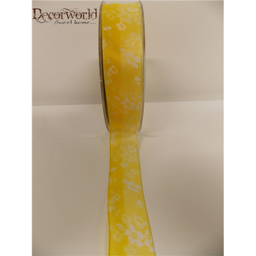 Textil szalag drótos virág mintás sárga-fehér 25mmx10m