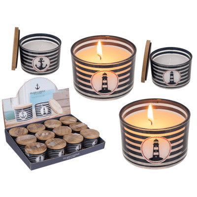 Gyertya fa fedelü üveg pohárban csíkos 7,1x7,8 cm - 2 színben