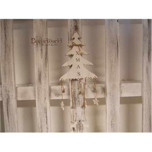 Fa fenyő, XMAS felirat, csengő, lógó csillag+rénszarvas, fehér 26cm AKCIÓ