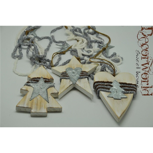 Szív-fenyőfa-csillag ablakdísz akasztós fa 11x78cm natúr-barna-ezüst 3féle