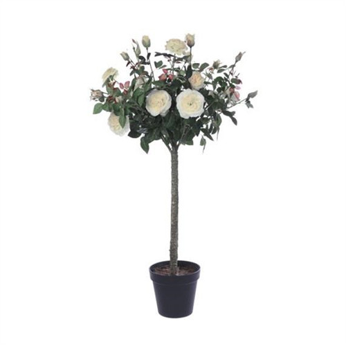 Rózsabokor selyemvirág műanyag kaspóban magasszárú 121 cm - Fehér