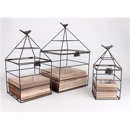 Fa virágtartó + fém kalitka madárral 38 cm - Natúr S/3
