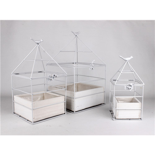 Fa virágtartó + fém kalitka madárral 38 cm - Fehér S/3