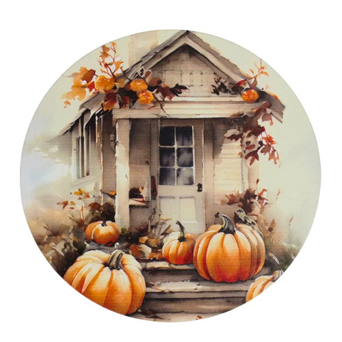 Nyomtatott fa tábla koszorú közép 14,8cm - Fehér-narancs tök házzal