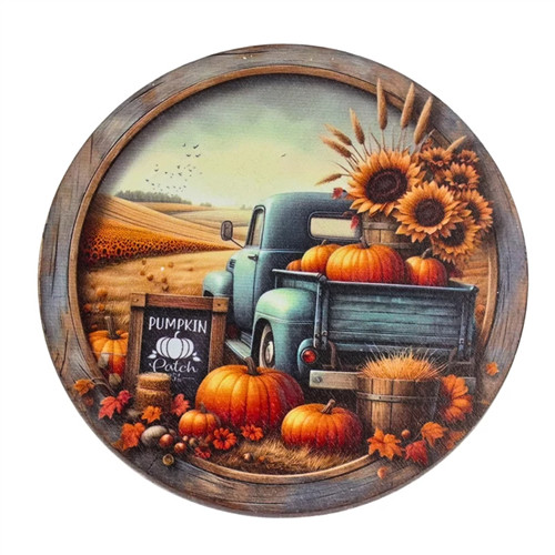 Nyomtatott fa tábla koszorú közép 14,8cm - Őszi táj kék teherautóval