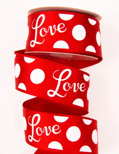 Szatén szalag drótos szegéllyel "LOVE" feliratos 38 mm x 6,4 m - Piros