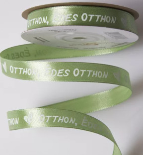 "OTTHON, ÉDES OTTHON" FELIRATOS SZATÉN SZALAG 12MM X 20M - ZSÁLYAZÖLD