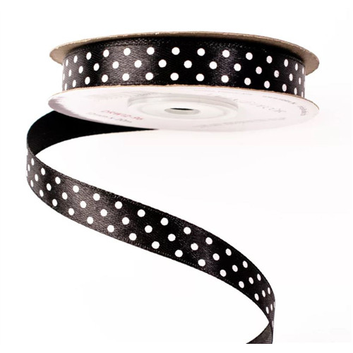Szatén szalag 12mm/20m fehér pöttyös - Fekete