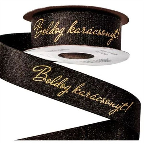 Szatén szalag csillogó "Boldog karácsonyt" feliratos 25mm x 10m - Fekete