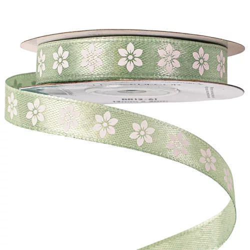 Szatén szalag "Virágmintás" 12mm/20m - Vintage zöld