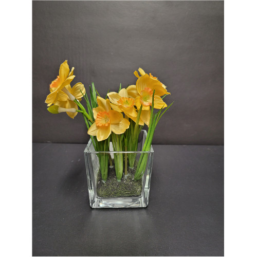 Nárcisz 3szál 18cm sárga, üveg négyzet alakú cserépben 8cm
