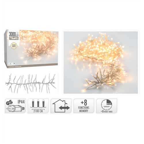 Fényfüzér cluster 3000LED-es 21,8m+3m (átlátszó vezeték) - Melegfehér (kül-és beltér)