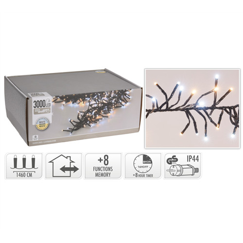 Fényfüzér cluster 3000LED-es 21,8m+3m (fekete vezeték) - Fehér/Melegfehér (kül-és beltér)